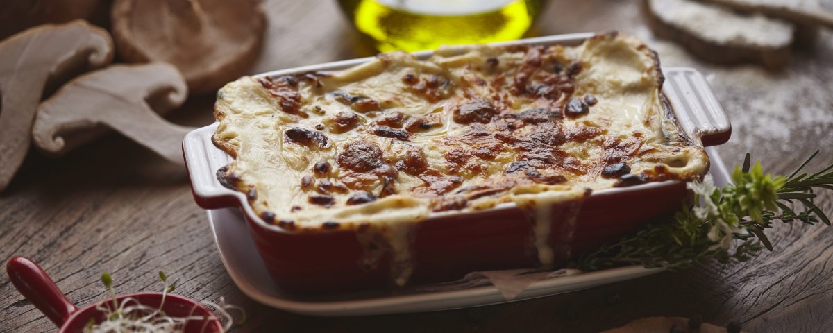 Espalhe duas colheres de molho de Shiitake no fundo do pirex e cubra com uma camada de massa, espalhe 4 colheres de molho, polvilhe com um pouco de queijo e cubra novamente com massa. Repita essa operação até chegar a borda do pirex. Salpique o restante do queijo, leve ao forno pré-aquecido a 250º por 15 minutos e sirva em seguida com um fio de azeite tartufo por cima.